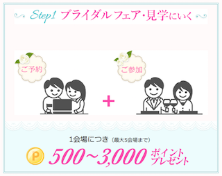 よく見るとブライダルフェア・見学は「最大5会場」って書いてあるので、3000ポイントx5、つまり15000ポイントゲットできるってことです。